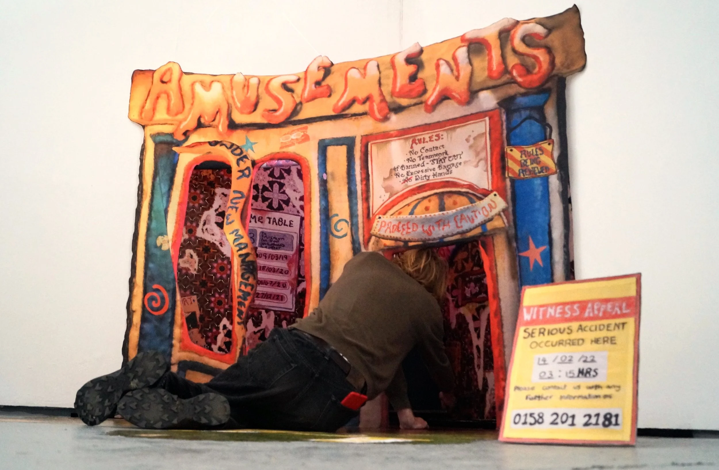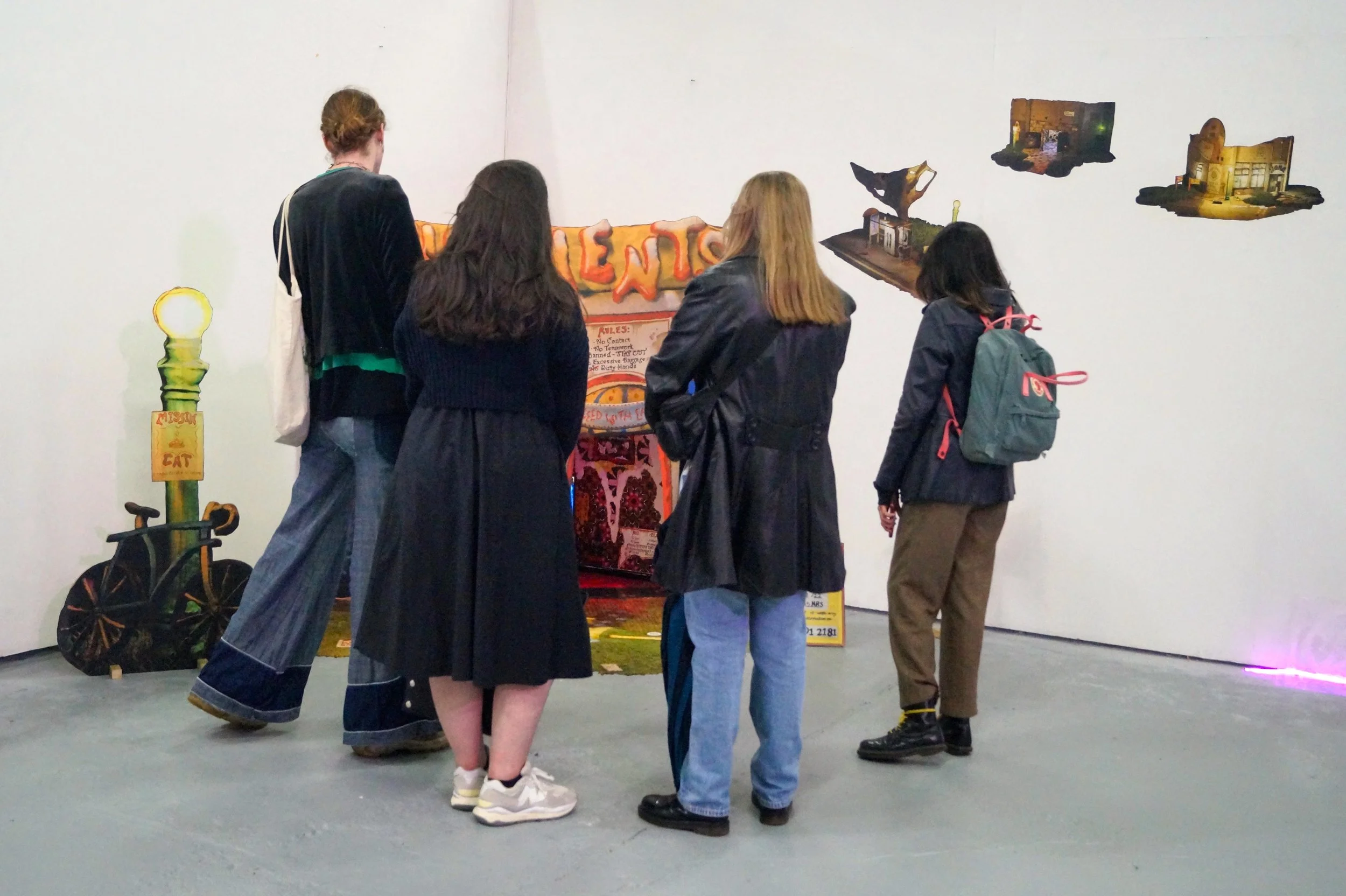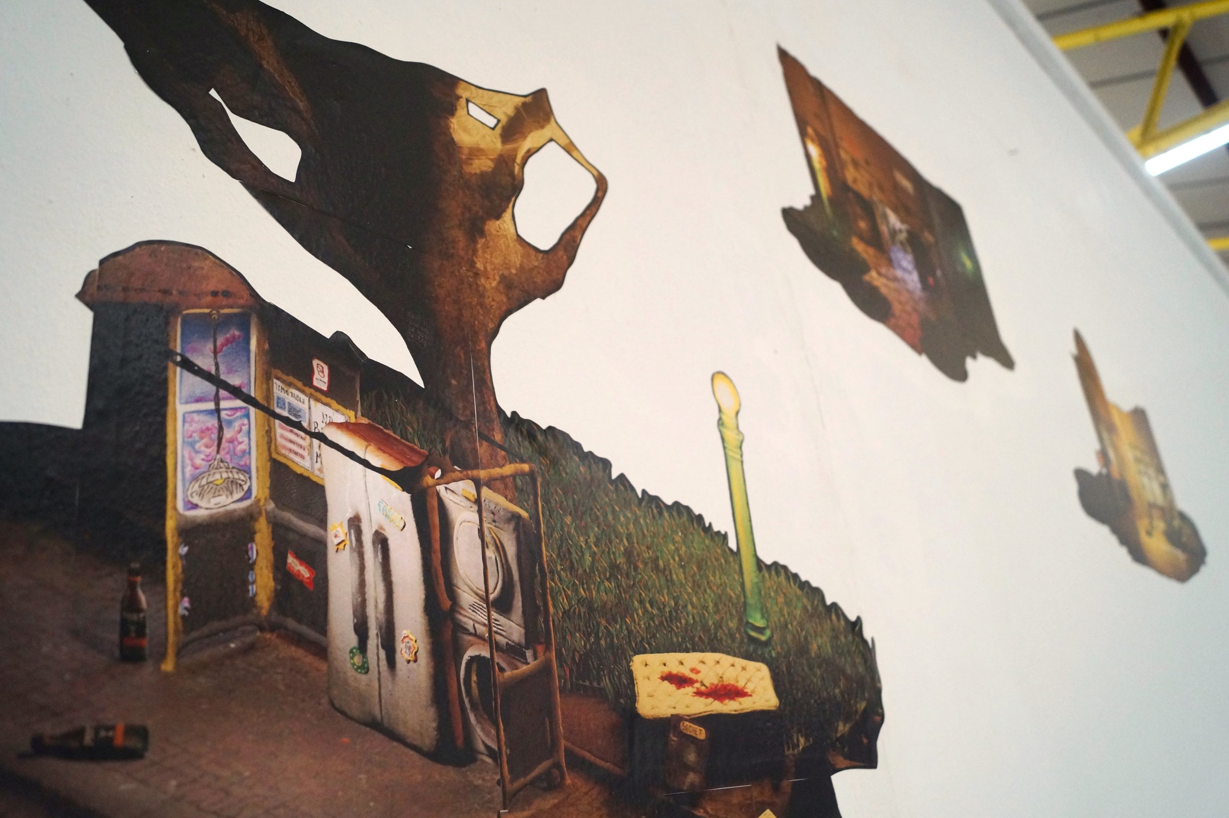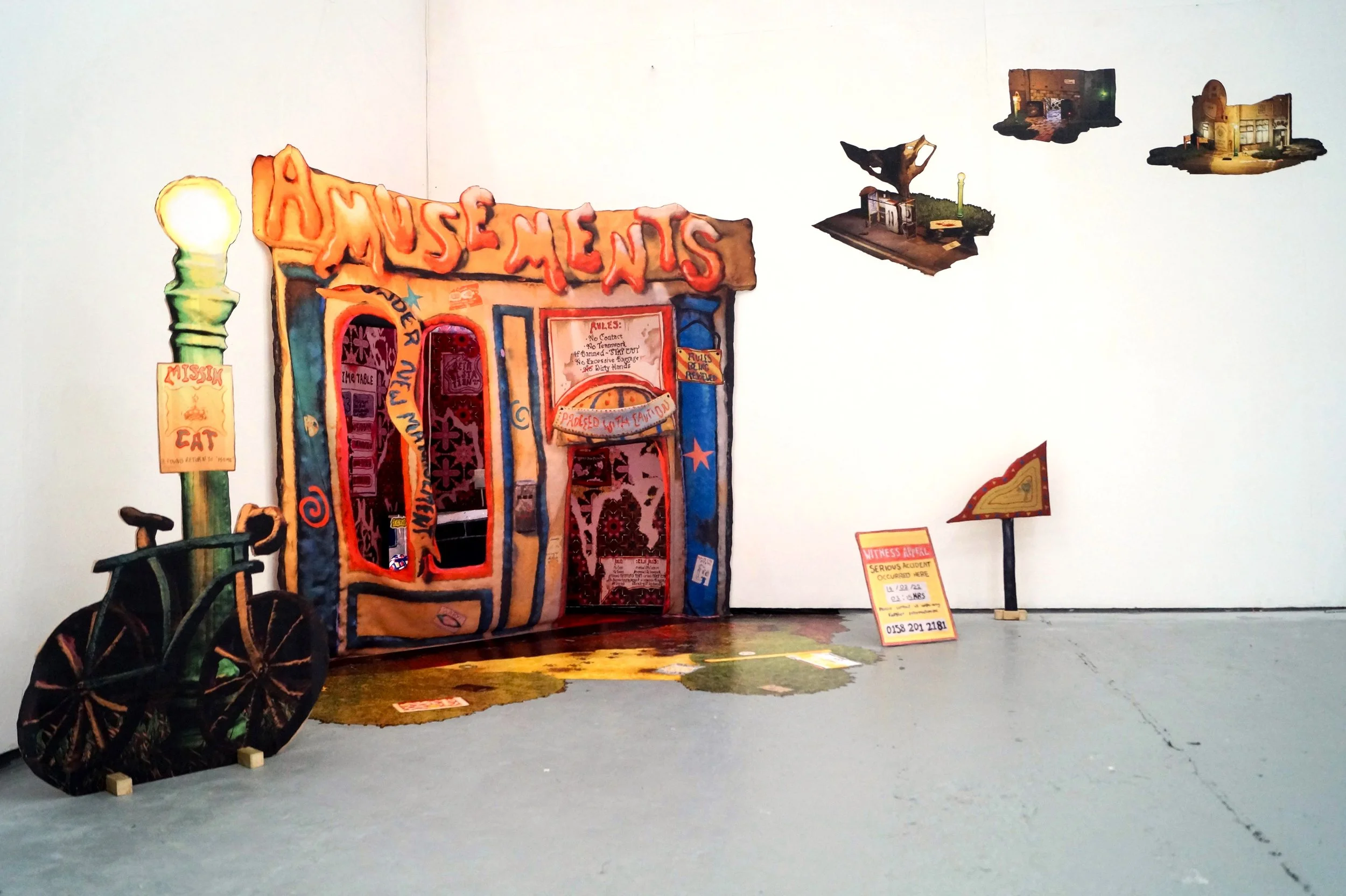 Comprising of A digital print fabric hanging depicting a clay model with hand drawn features, lit and adorned in 3D software. - Other fabric prints mounted on free standing jigsaw cut wooden boards.