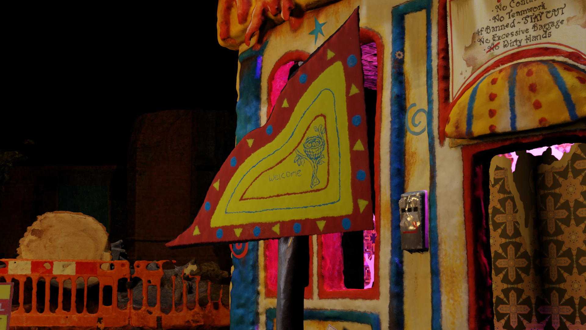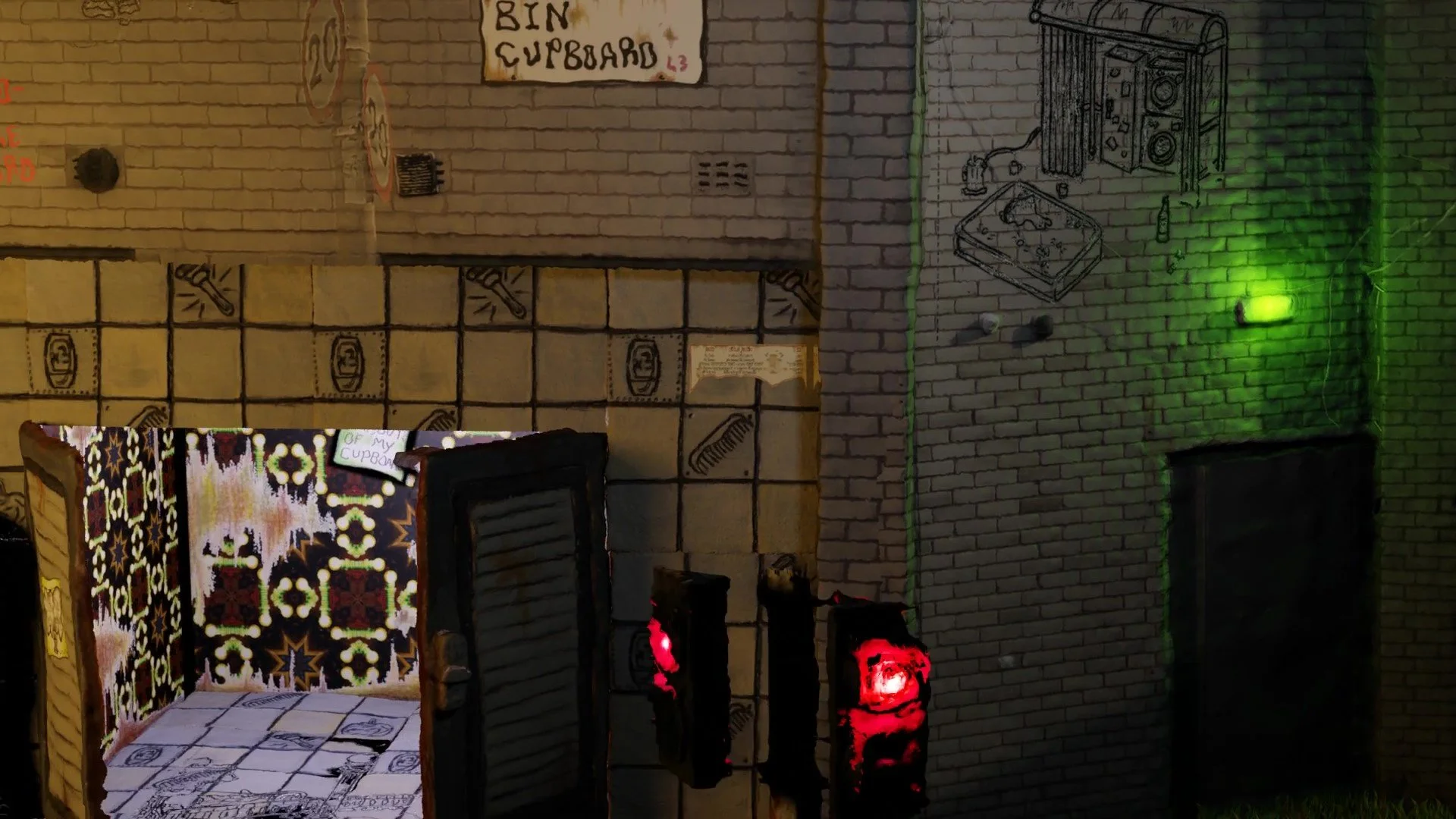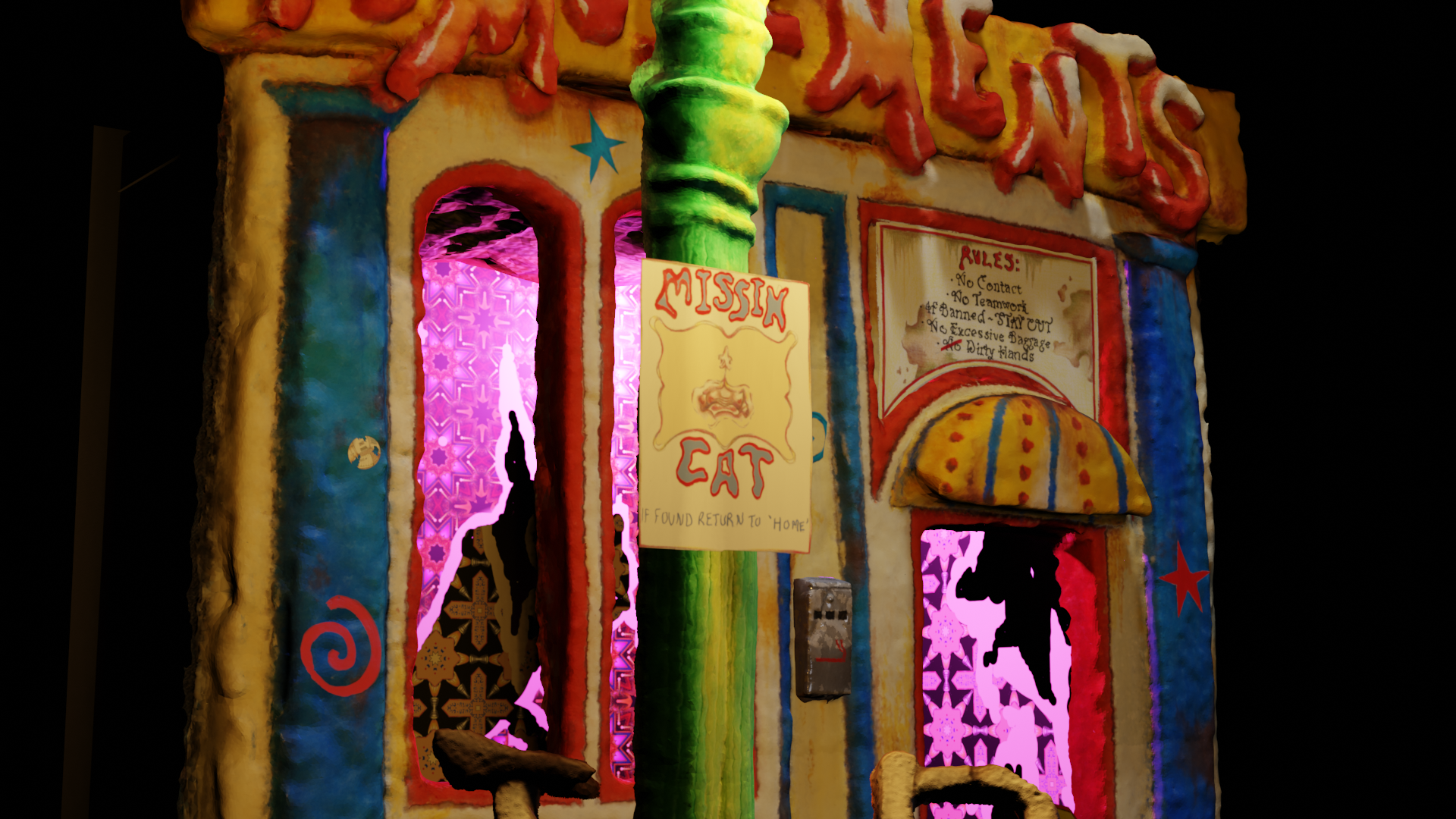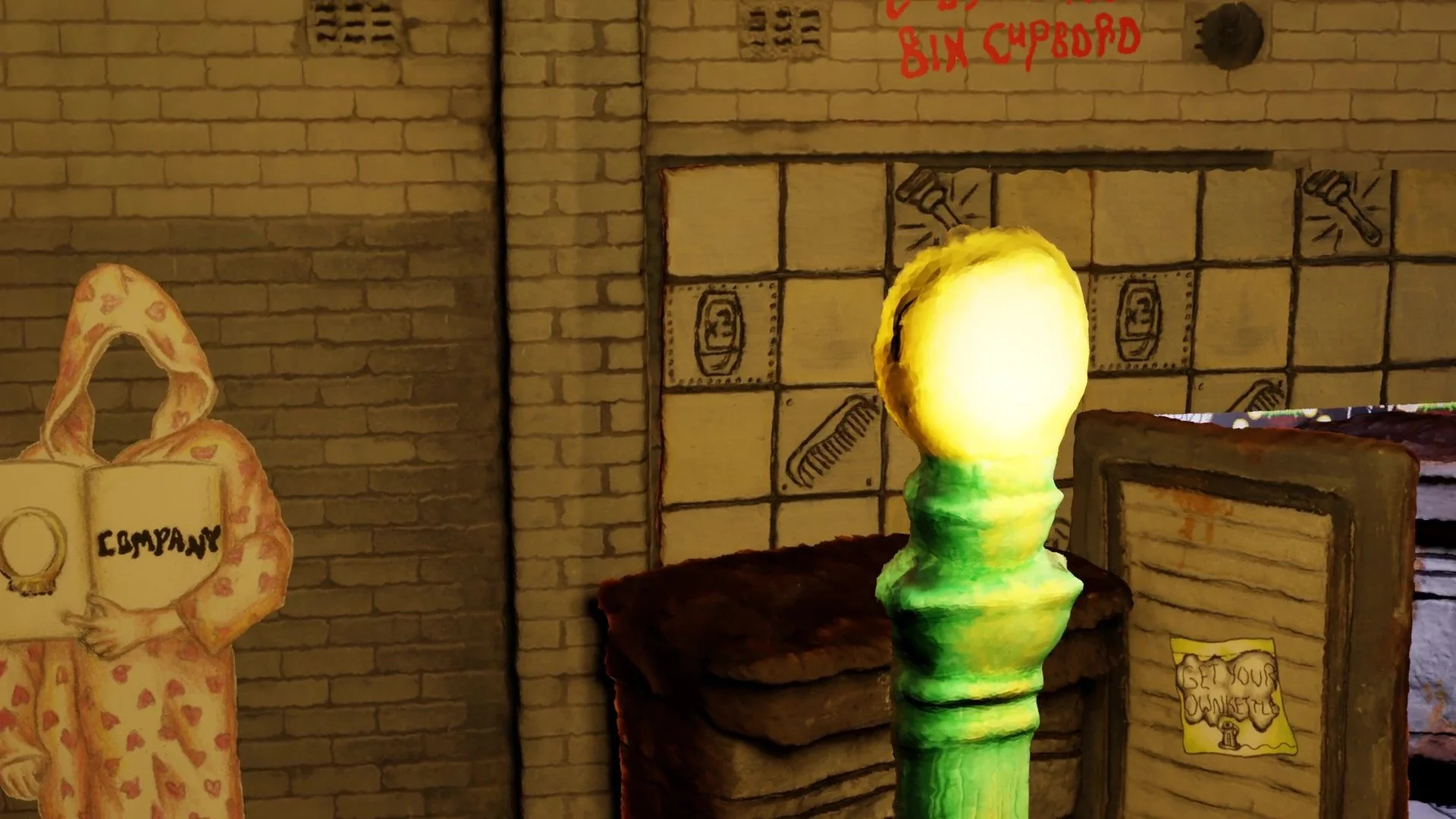 Comprising of A digital print fabric hanging depicting a clay model with hand drawn features, lit and adorned in 3D software. - Other fabric prints mounted on free standing jigsaw cut wooden boards.